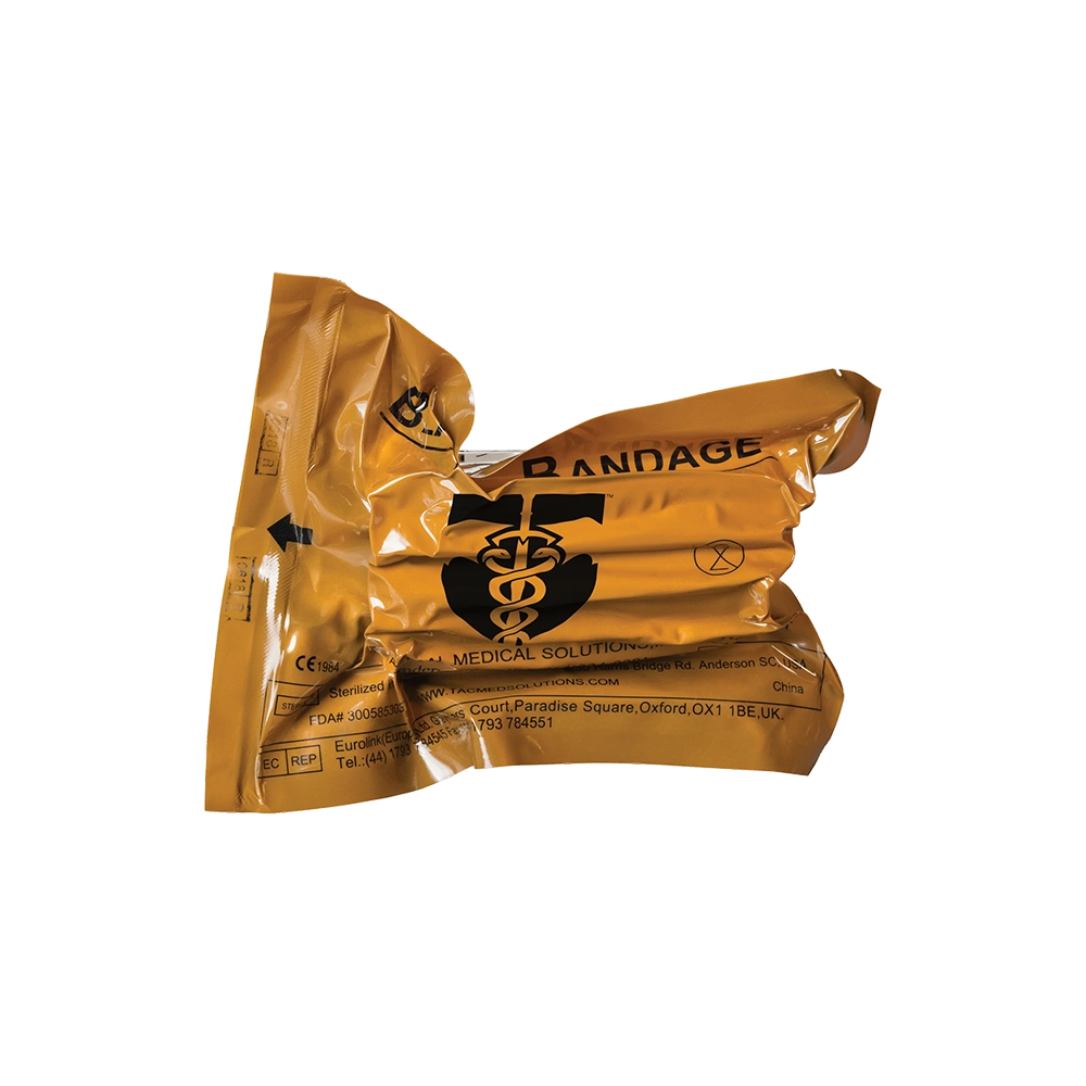 Bandagem elástica estéril, com curativo, desenvolvida para permitir a rápida contenção de amputações traumáticas, queimaduras, eviscerações e outros grandes ferimentos. Possui grande almofada não aderente e uma folha plástica oclusiva removível que pode ser usada para cobrir órgãos abdominais expostos, minimizando a perda de calor e umidade, ou para proteger tecidos queimados do meio ambiente. A BLAST® Bandage é grande o suficiente para cobrir totalmente as costas ou o tórax da maioria das vítimas.